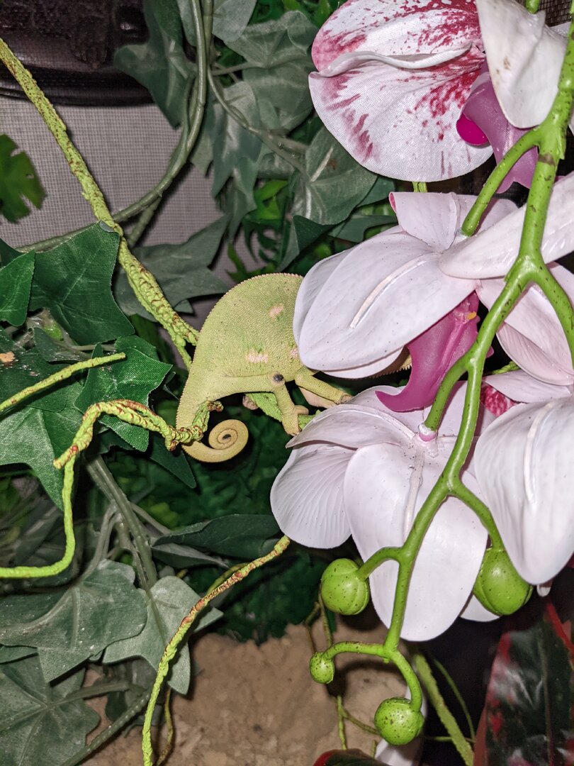 History - I bought her at a reptile show from Southern Reptile Supplies in Austin, TX. They told me to buy the chameleon kit and a bunch of plastic plants which I realize now was bad advice. I've been watching Neptune Chameleon's YouTube channel and am waiting for the large UVB light to arrive. I just put a 1 gallon bucket of play sand in the enclosure yesterday. I'm hoping I'm not too late and that she isn't egg bound already.