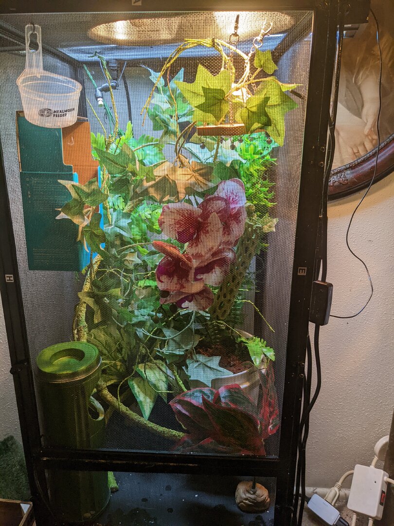 Humidity - this is an area I'm struggling with. I spray the enclosure twice a day...the mister I bought has a leak that I haven't figured out how to fix yet. Right now in Texas summer, it's humid already.
