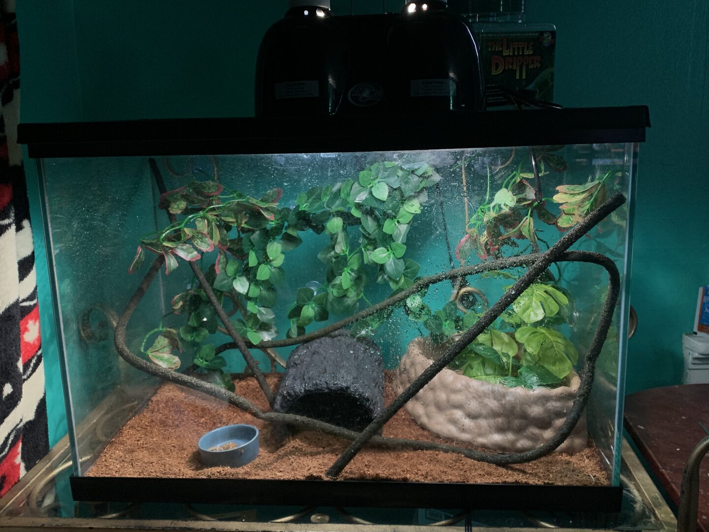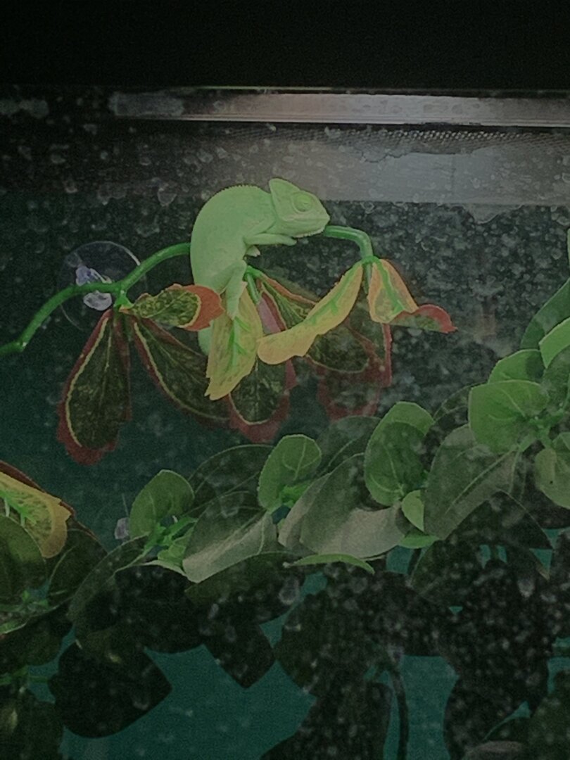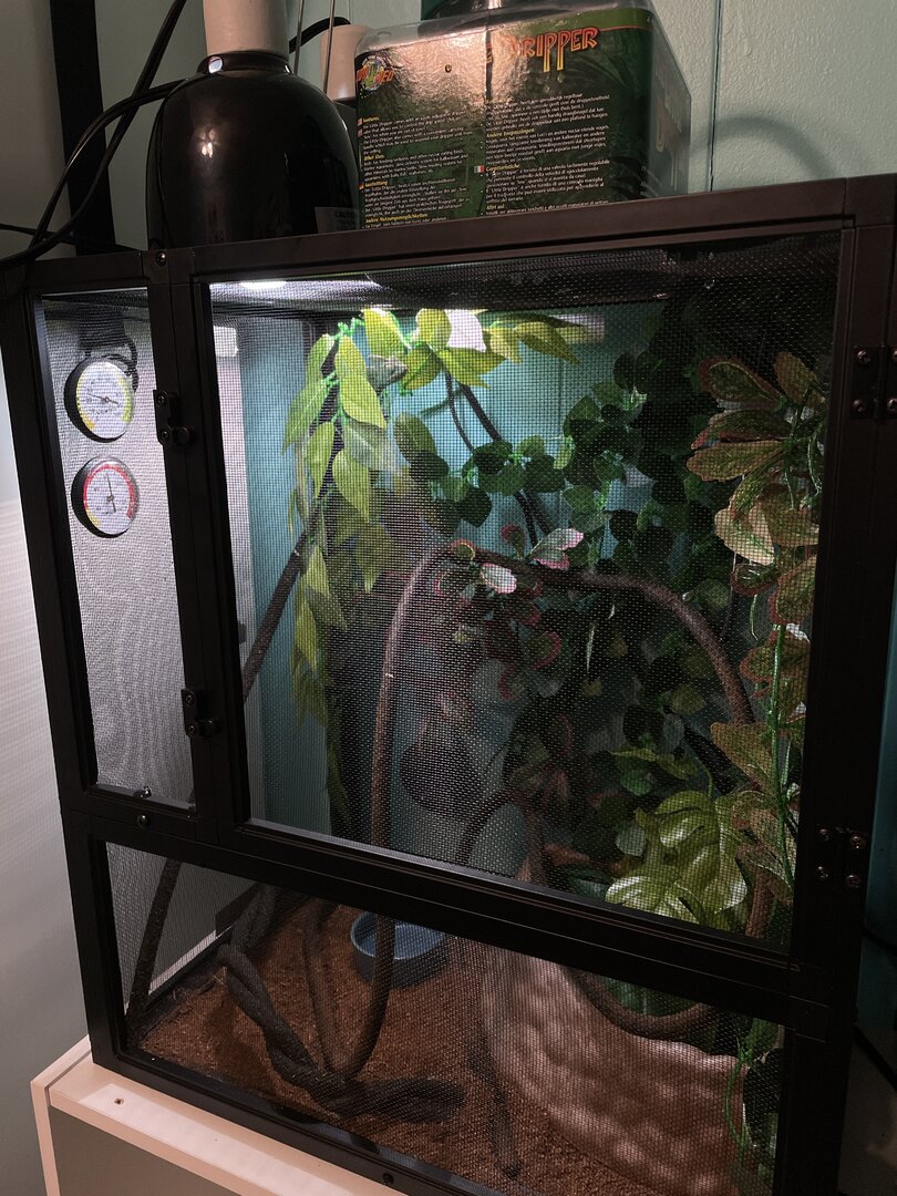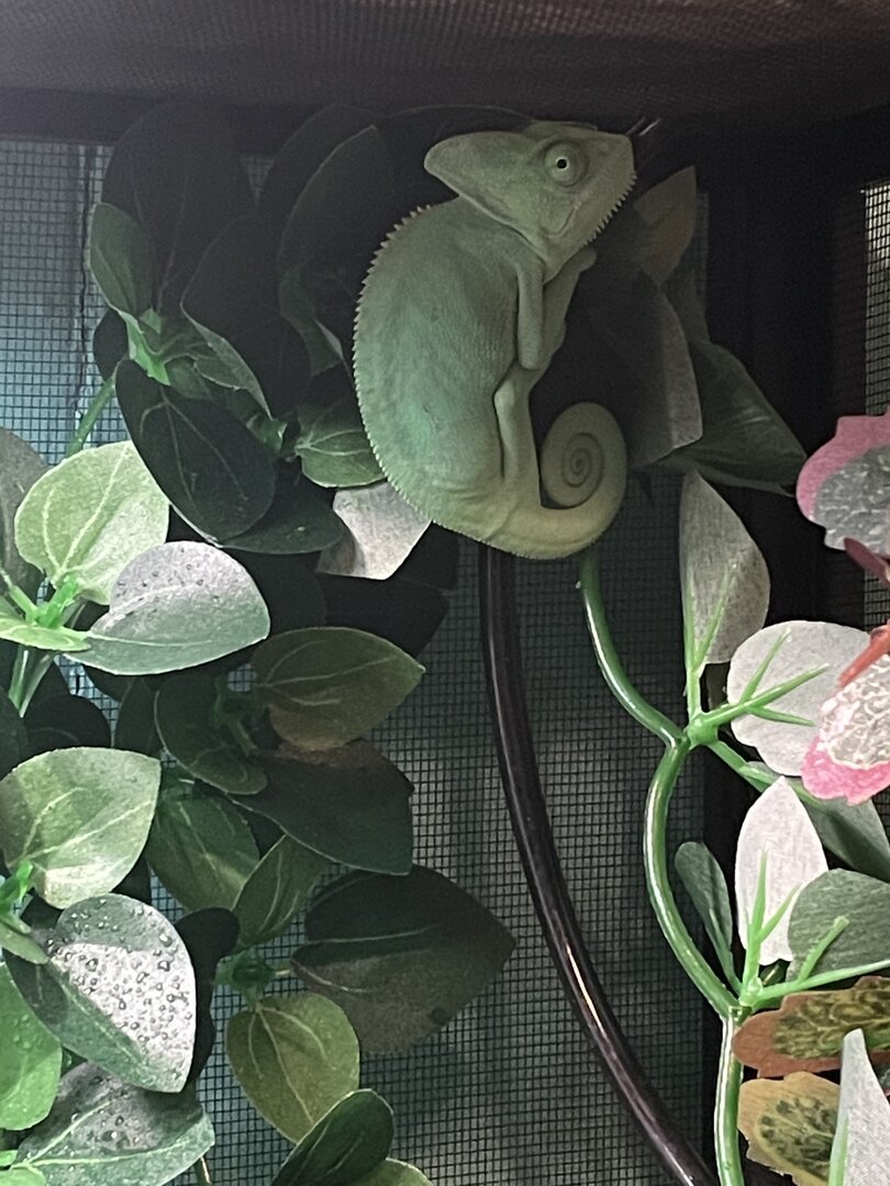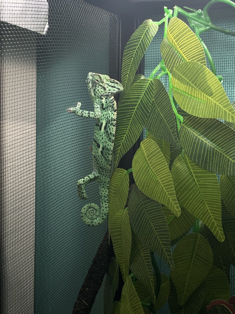 Re Plants - you said..."no real plants, 5-6 fake vines and a stand up fake plant"...fake plants are not recommended for veiled chameleons in particular...they munch on them frequently and could become impacted if they ingest fake leaves. Use real well washed, both sides of the leaves, plants that are nontoxic.