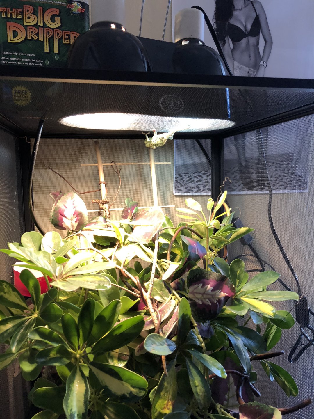 • Watering - What kind of watering technique do you use? How often and how long to you mist? Do you see your chameleon drinking? (I have a dripper running often and I spray the cage with a mister from homedepot a few times a day. Also, when I shower the humidity fills the the room)