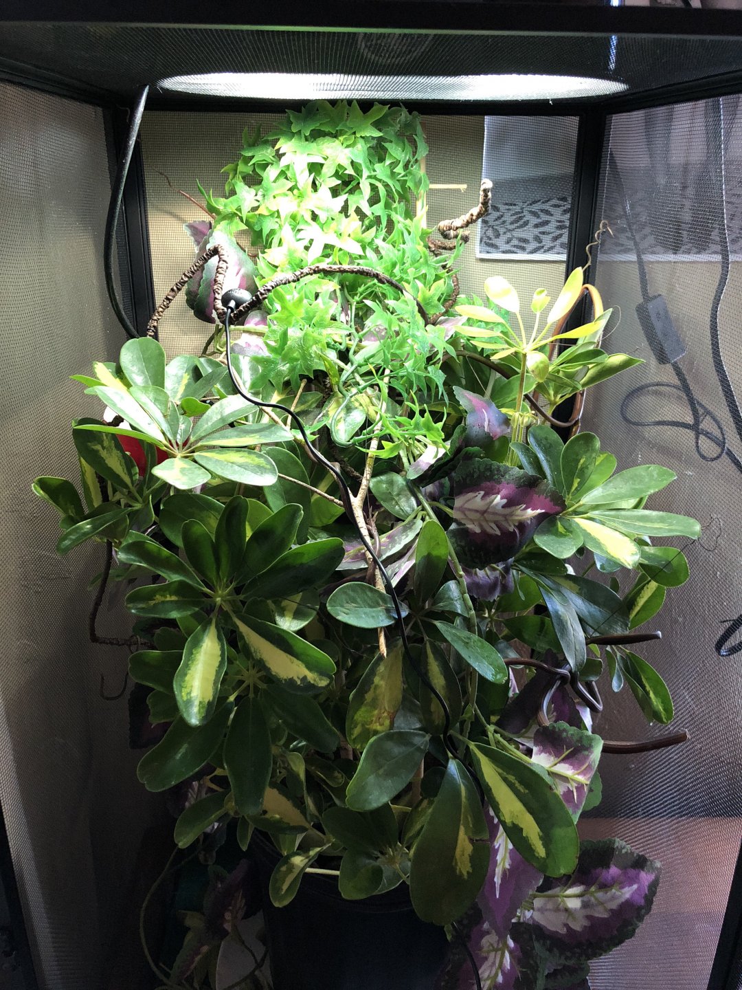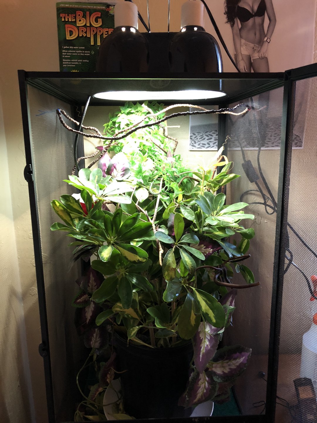 As for the UVB, you will need to get a hood for the linear bulb, yep. They're readily available at pet stores. I like the improvements you made to your enclosure (also that's a nice looking schefflera in there)! Still, I'd recommend fastening a branch of some sort which goes all the way from one side of the enclosure to the other (you can secure such a thing with push pins, garden wire, or zip ties) - looking good though!