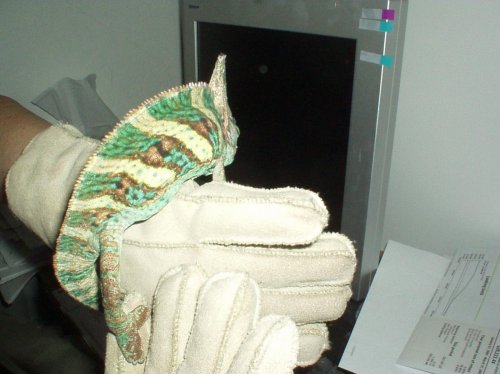 Hey guys, ok so ive had pieces for 2 months now and i think he is about 7 months old.. male veiled he has the greatest cage ever. if i stick my hand into his cage hes cool with me feeding him watering him anything but trying to touch him, if i go to pick him up (the proper way slowly sliding my hand etc.) he puffs up and trys to bite me every time (no matter what coloured clothes im wearing) is this normal.? is he just loving his house? territorrial? so after enough of that i decided to try a green garden glove... when i use this to try and get him out he puffs up turns paper white and freezes..... like he is scarred to even move and his hands get all shaky..... but no stress spots... wierd any comments, or help.. i hope this is just a juvinile thing that he will grow out of.