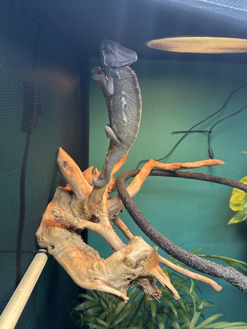 Cut that extension off... They will go to the highest point just because it makes him feel safer. Rather than stay under UVB or heat. Nothing should be higher than the basking branches at 8-9 inches from the light. This is their level that is safe under UVB. HIGHER is dangerous. Especially when it is close to heat or uvb.