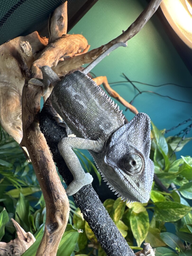 Hi! We set up our big enclosure for Rango, there’s times where he goes on this stick and goes this colour. What is he trying to tell me? I know he needs a canopy near his basking and I’m looking for a good plant. Is that what it is or something else?