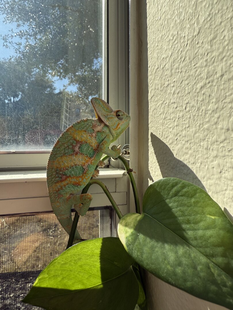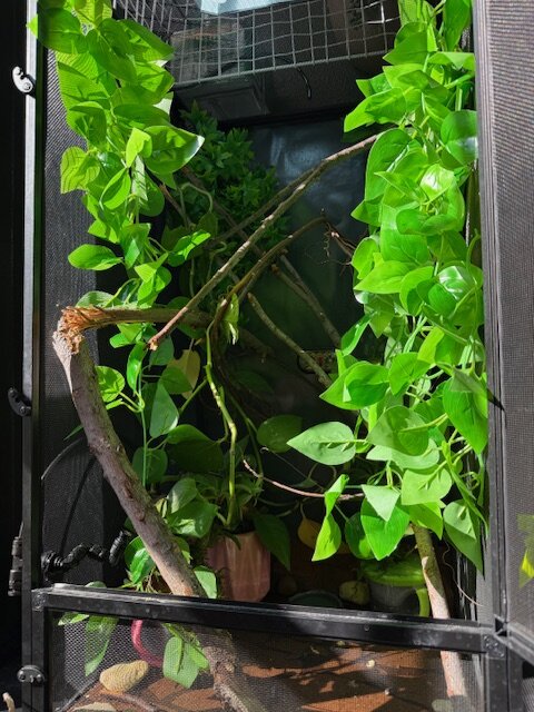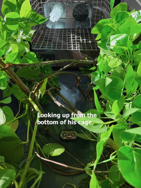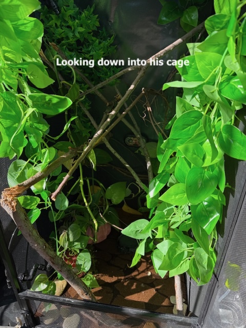 He is of a size where he has to be in a 2x2x4foot cage. Creating an environment that has everything he needs in it. And unfortunately he is too close to the window. And now that he has been given the freedom of the window he will not want to stay in a properly set up enclosure with the right lighting if he can see the place he has preferred.