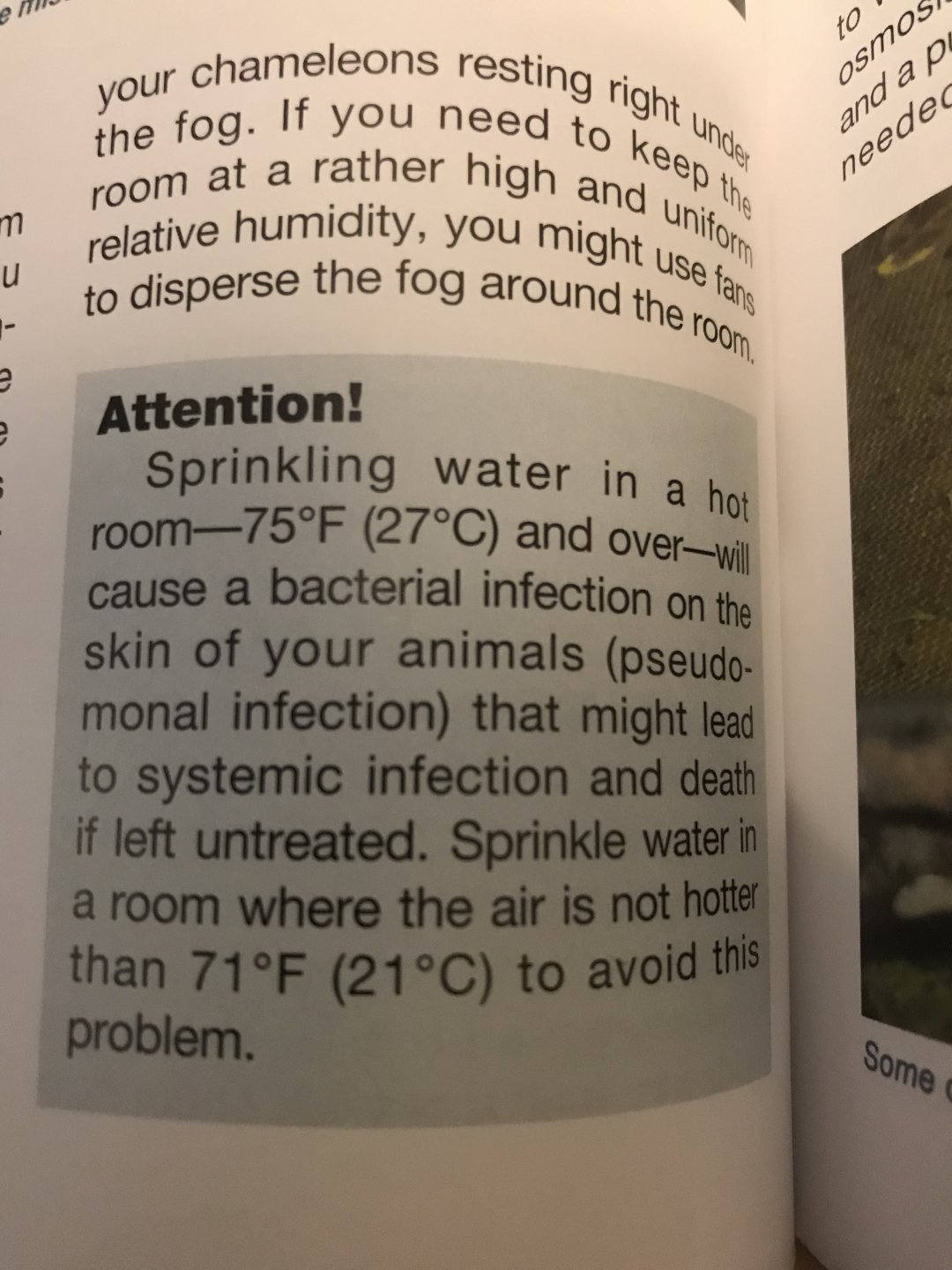 So I was reading a book on chameleons and it looks like this guy is saying not to mist your chameleon in temps above 75f. My chameleon isn’t supposed to go under 75 degrees ideally so that basically means I cant help him shed by misting him? Or is this guy full of it? Took a picture of the paragraph in question.