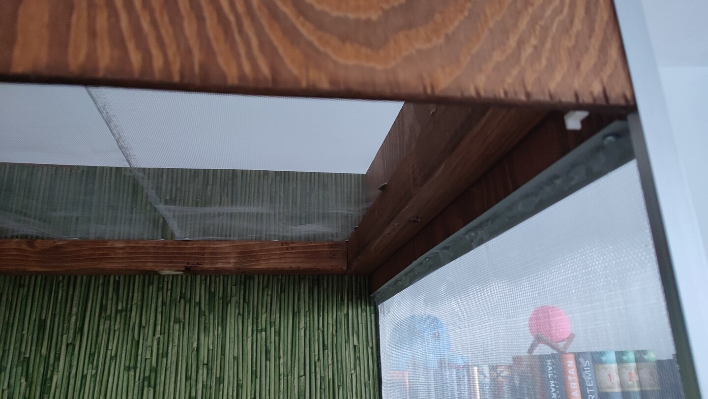 ) and I've come to this question. Will he be able to climb from side to top screen? The top is from 2 pieces as i ran out of screen almost, and isn't joined together in the middle at the moment. I'm considering leaving it like this, since it's strong enough to hold lamps and all, but he would be able to get caught in the gap he would create by his weight on one part of the mesh if you know what i mean. The gap between sides and top is fairly large, about 10-15cm and also a bit to sides as there are wood pieces holding the mesh as you can see on picture. Would he be able to climb through this as well? Thanks!
