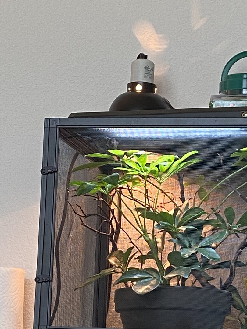 His enclosure is currently in my office and I work from home, so I am in here 5 days out of the week. Last week when we got him, I was off a couple of days so I wasn’t in the room much but now I am working in my office again and noticed he isn’t moving as much as before. His color is dark and I am scared he is not happy or maybe my office is too much for him with me here. However, I really don’t have anywhere else to put him as my other room is for my 3 dogs and hamster, and my bedroom is usually kept really cold vs the house. He is across from a window but we are on a corner so not much action happens outside the window, so I don’t think he is stressed from outside. Lights - we turn them on at 8 am and turn them off around 8-10 pm. The only reason being he sometimes is still moving around and active, but when I see he is finding a place to sleep, I turn them off. Latest I ever keep them on is 10 pm though.