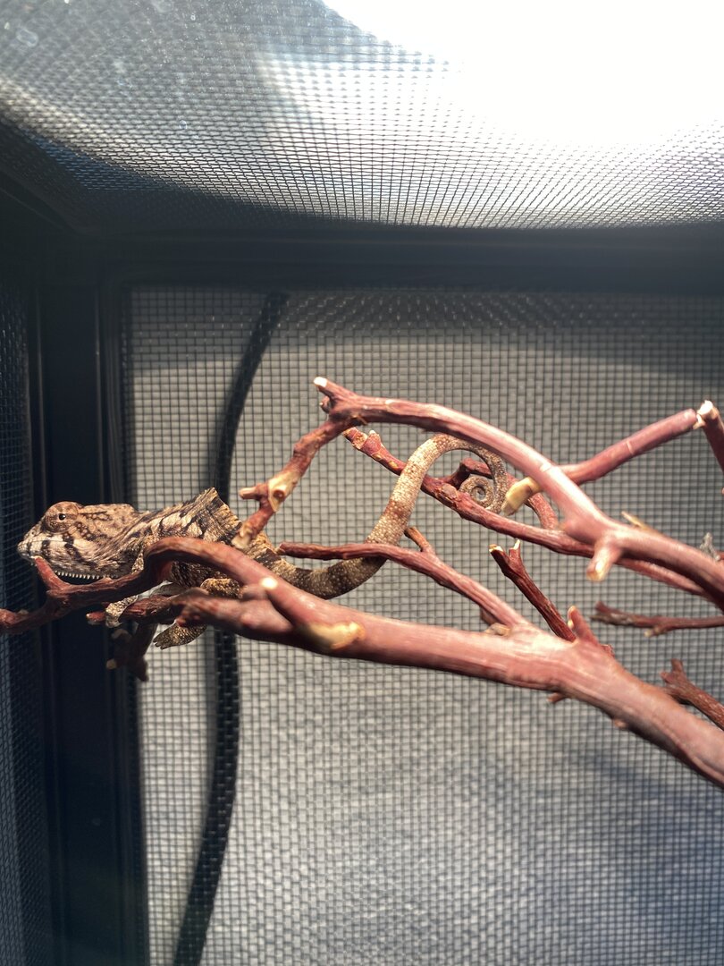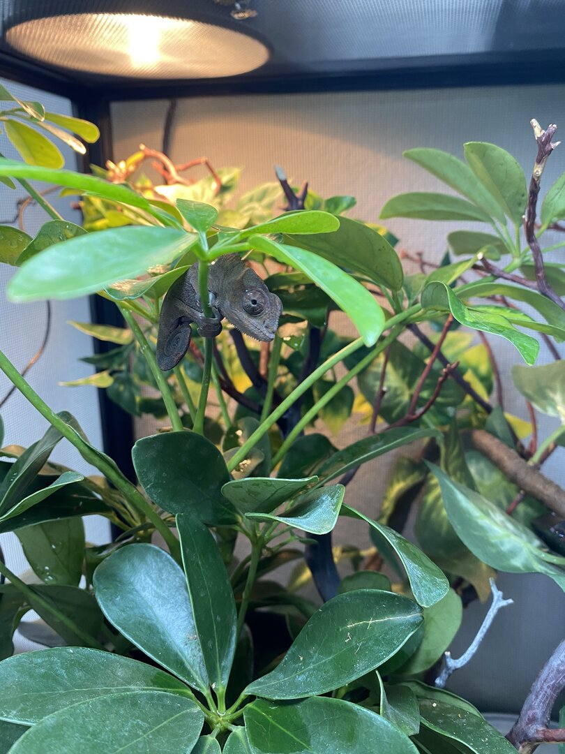 I just bought my chameleon from a reptilian in DFW, and he is a Panther Chameleon. They said he is about 3 months old, and he was born at their store. She said he had a big attitude and has bitten multiple members of the team and he also was bullying his siblings so he was separated. My husband and I loved him when we saw him, and were willing to take him on. We bought a good sized open enclosure for him, a long 5.0 UVB light and a 60W heating lamp. I also have a Schefflera Tree in his enclosure along with some fake leaves and lots of branches for him to crawl on. I spray around 2-3 times a day to help keep it humid and feed him 10 gutted crickets a day. I was giving him a calcium powder with D3 every feeding but read that I shouldn’t be doing it that often and only did it for 2-3 days in a row. I am going to go get calcium without D3 today to start using instead. I also have the calcium powder with LoD but haven’t given it to him yet because I’m scared of overdosing him.