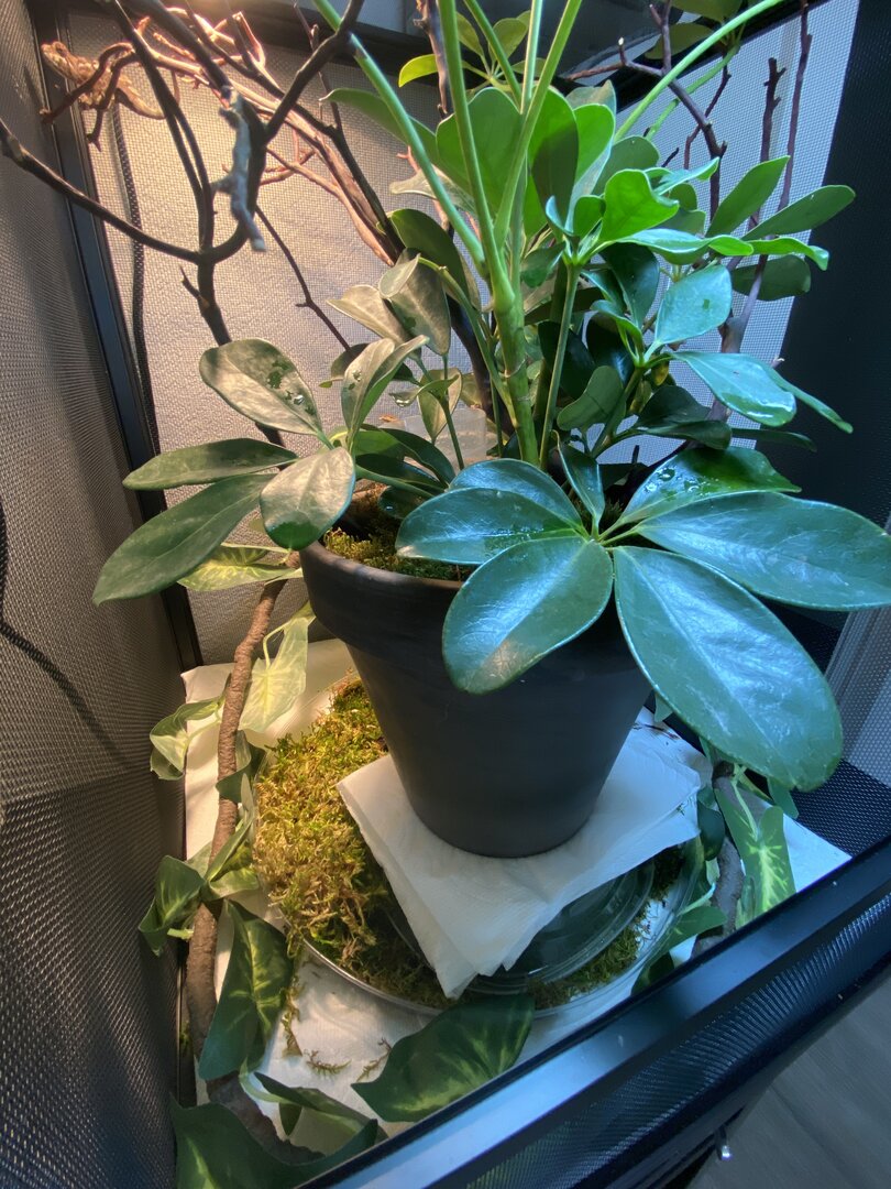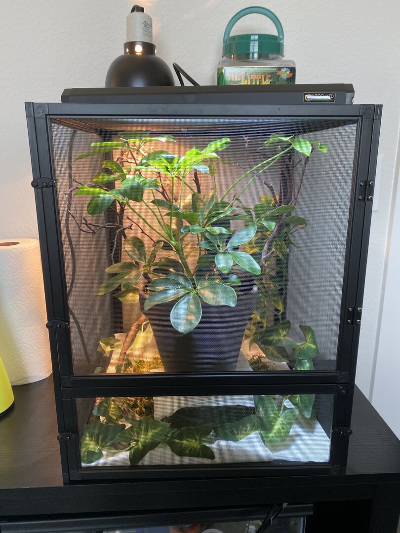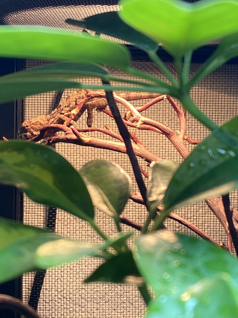 when he first came home, he was WILD. He moved around so much, climbing on every branch and on the enclosure walls. He was active and moving a lot more than I thought chameleons should. Disclosure, I have had to redo his enclosure almost everyday since I got him because my plant was drowning from the dripper, and water was accumulating everywhere. I ended up buying moss to put at the bottom of his enclosure and on top of the plant to prevent root rot. I know this may have stressed him out a bit, but I didn’t want my tree to die either.