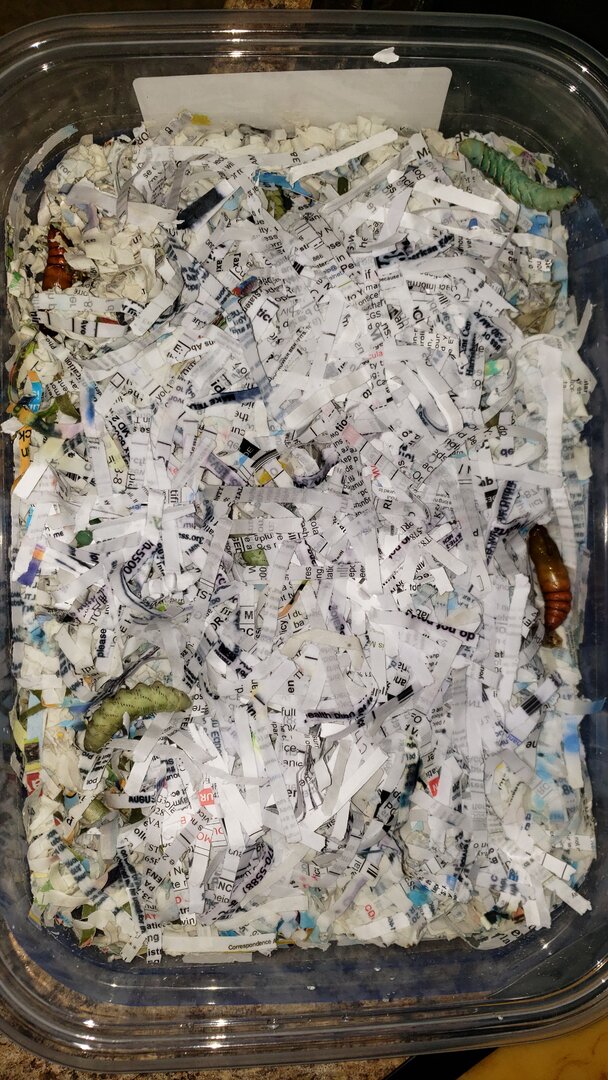 This is my first time allowing hornworms to turn to moths. I'm wondering if these look ok. All I could think to use is our shredded Bill's as substrate. ? I guess they might be good for something after all. Hahaha. Although I'm not sure if it's ok to use sheddes paper or not. ?