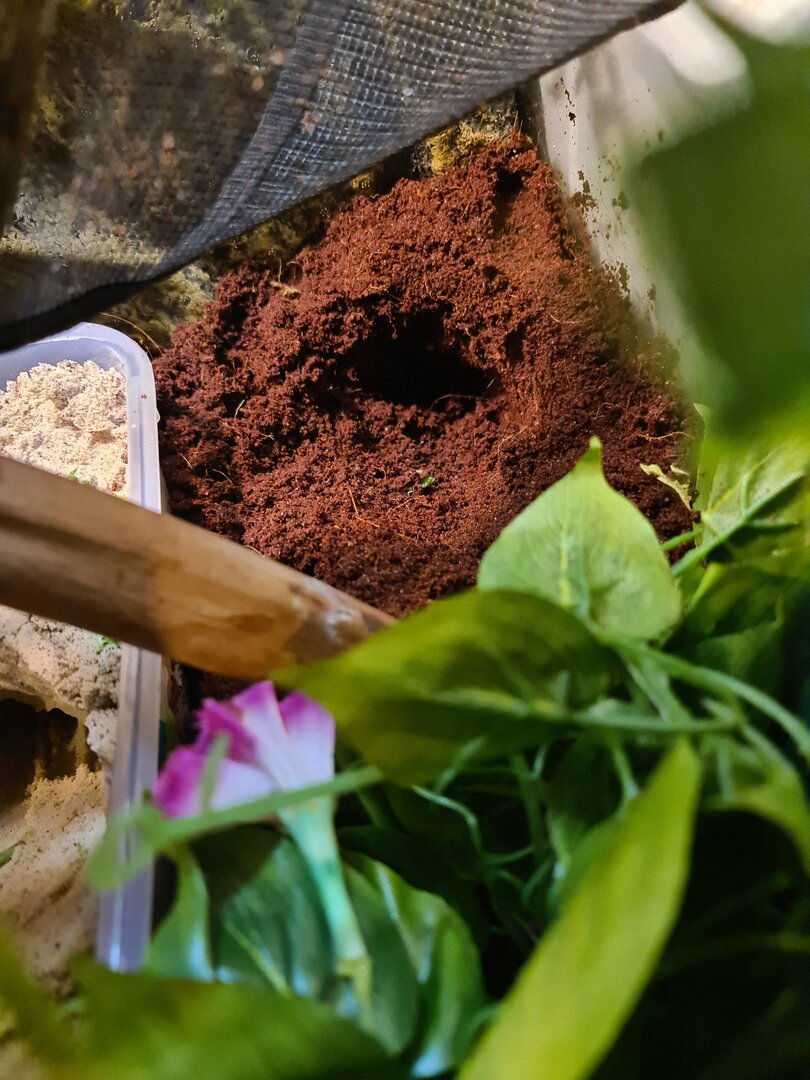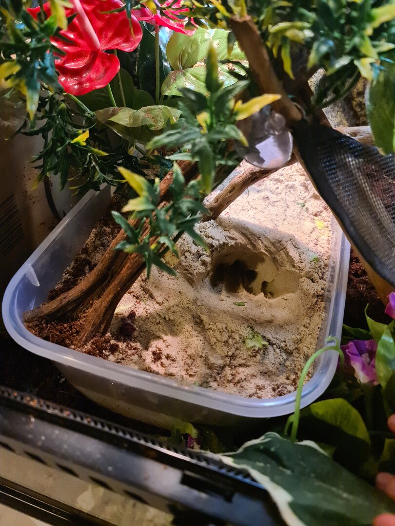 My chameleon is showing signs that she is ready to lay. I set up a laying bin using moist playsand but she seems to only want the substrate so I filled the area she keeps digging at with more substrate. She seems to keeo digging then walking away and coming back to it again. She also is digging a crater instead of a tunnel! I don't know why she is doing this but she also hasn't eaten in a few days... should I be worried or is this normal!? I'll add some pictures of her and her crater.