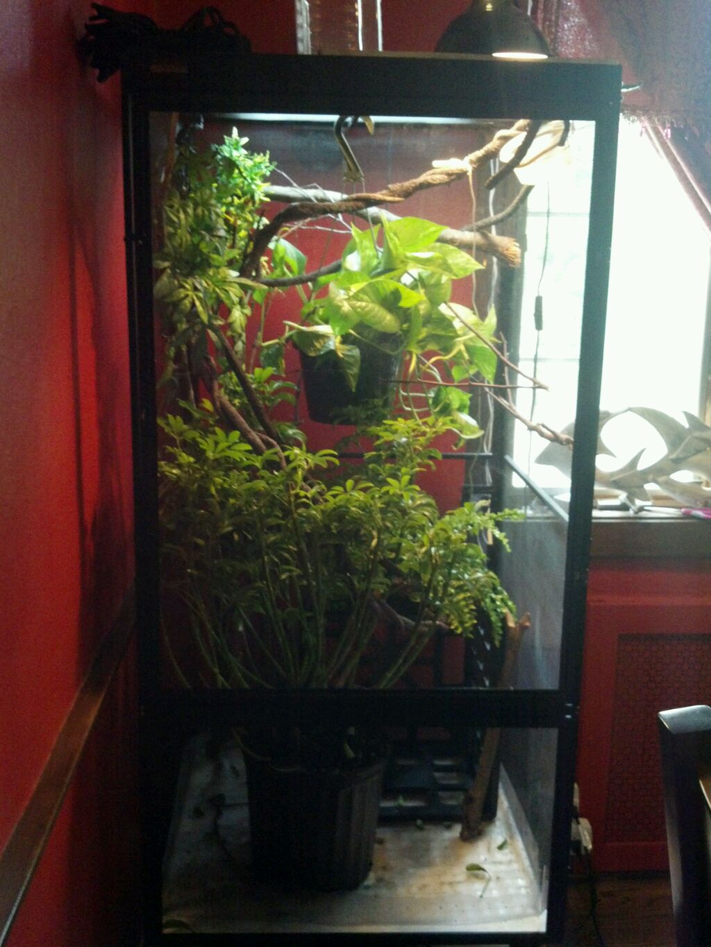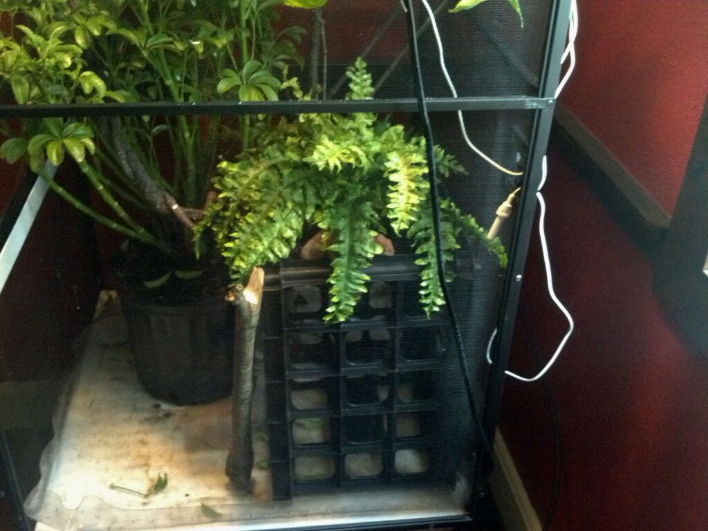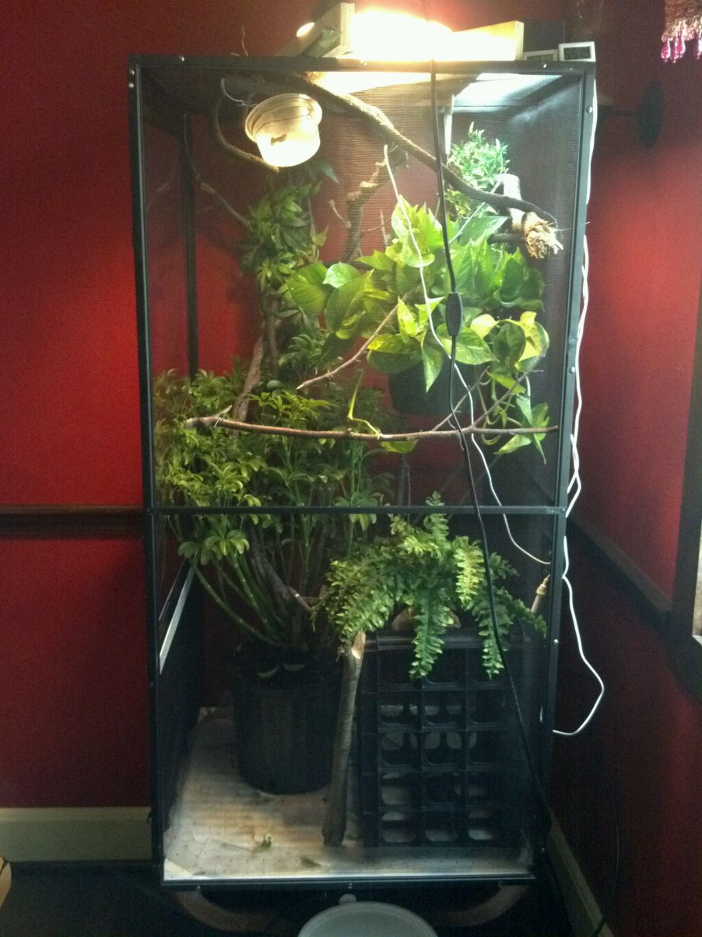 Here are pictures of the new set-up in her enclosure, and where she's laying. I'm sure the enclosure needs more work (when don't they!) but I can't imagine her reacting like this just because she doesn't have enough walkways and perches.