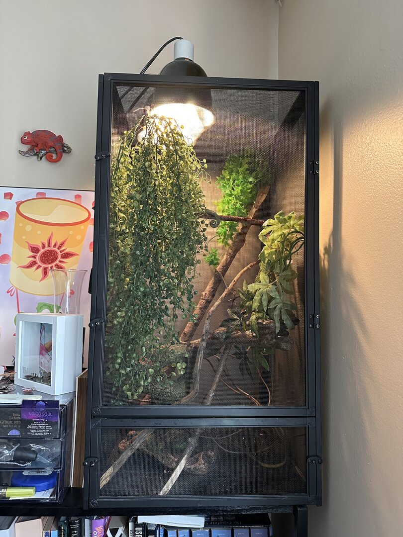 I’m hoping someone can help me figure out if my little guy is okay! I just got him about a week ago now from a friend of mine who is a vendor at reptile shows. She doesn’t breed chameleons- she found him from another vendor- so she doesn’t know much about them. I’ve had a veiled before so I sort of know what signs to look for that something is wrong and I am a bit concerned. So he is about 8-9 months old and he has been eating just fine (at least 2-3 crickets every day) and I mist his cage about 3 times a day with a handheld mister (I’m going to be getting an automated one hooked up as well). I haven’t seen him drink water at all, but I’m not sure if he’s just not doing it while I’m looking? My concern is that his eyes look a little droopy and then tonight when I came home from work, I found him sleeping standing up with his chin up which scares me because I know that could be a sign of a respiratory infection. I’ll attach a picture I just took of him for reference. I haven’t seen him do this before and he seemed perfectly fine before I left for work today. He ate 3 crickets this morning. Should I be concerned?