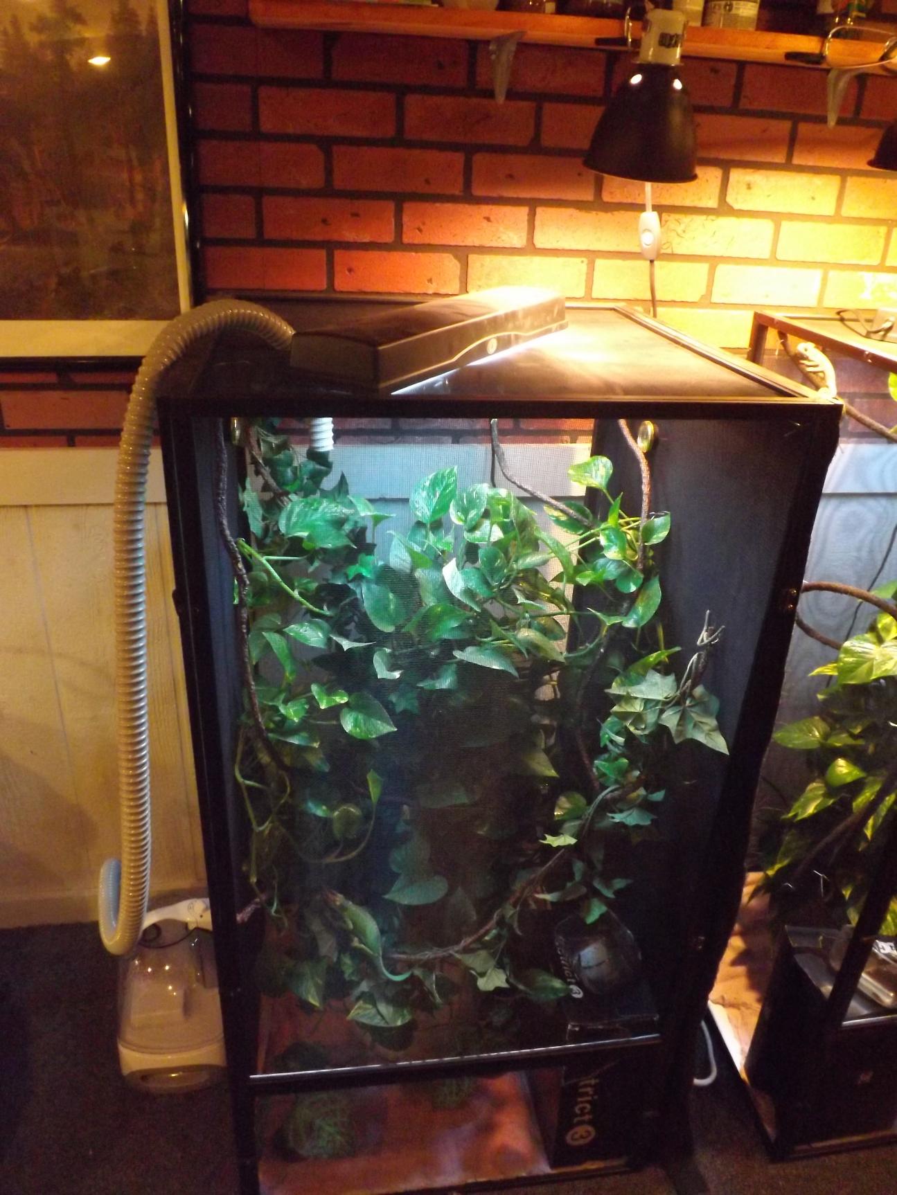 • Humidity – I have a hygrometer in his cage. The humidity usually stays anywhere from 50% to 70%. I have a humidifier with a hose running inside the cage. It runs in hour cycles. On for an hour and off for an hour.