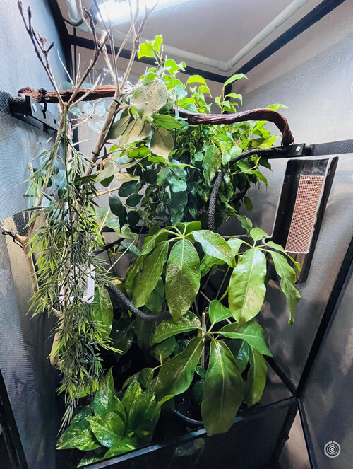 The updated photo is a weird macro angle so I apologize for it looking weird. We did clip branches down to make sure he’s a safe distance and his lamps are hung from the ceiling.