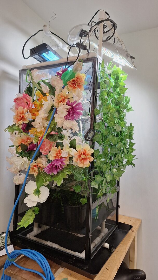 She has a Benjamin ficus, palm tree, pothos, and an umbrella tree in her lay bin. The palm is in a double pot hanging in the back and the ones on the floor are on wire cupboard spacers. I have a plant rehab corner to swap out the plants and try and nurse them back when they look sad. I also invested in a jungle dawn for this cage.