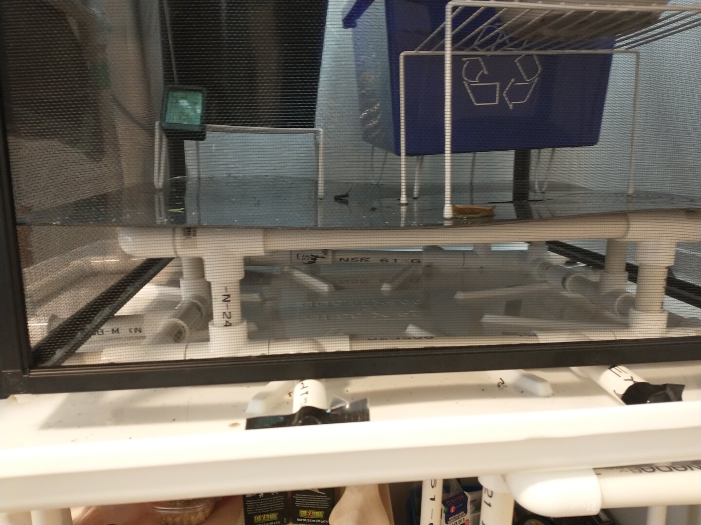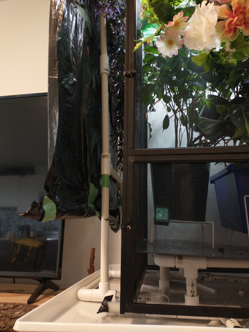 The base stand is built out of 1/2 inch PVC pipe I had leftover from a home project. The back left end also sits partially on my homemade entertainment stand. The front legs are cut 1/4" shorter than the back to make the water pool towards the front, where the drain would be installed on the drip pan. The drip pan is originally for a washing machine, it comes with a PVC drain attachment. I've not had to install the drain, yet; but I will if I get an automated mister. It's set up to drain into the 5 gallon bucket below.