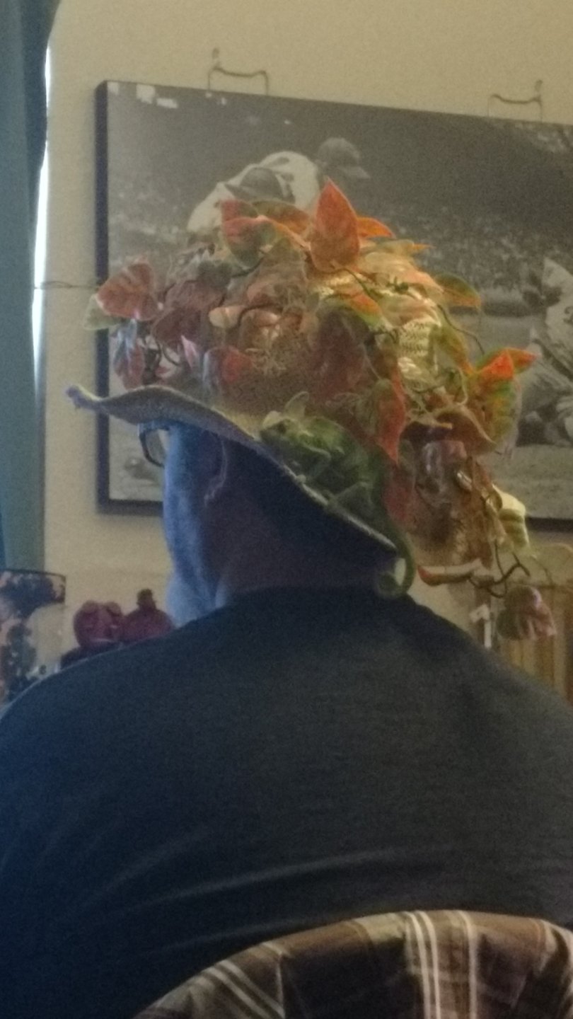 ...when you are a male who bought a garden hat, secured vines on it, and wear it when your watching TV so your chameleon can climb around while feeling secure.