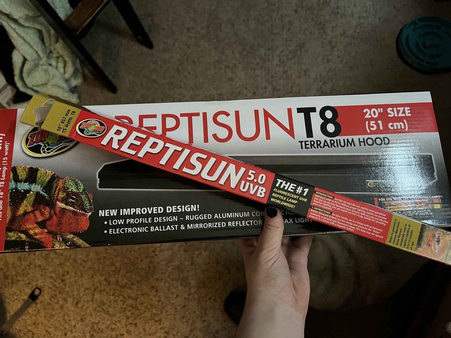 - Lighting - Zoo Med ReptiSun 5.0 UVB Tropical Compact Fluorescent Bulb, and Zoo Med Daylight Blue Reptile Lamp. (I've heard the kit I purchased has inadequate lighting, though I've been given different answers when I ask what is the correct light, so I've just been using the kit bulbs)