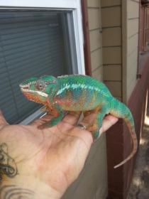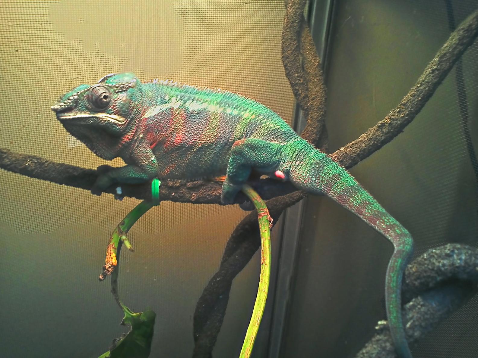 Your Chameleon - Male, blue barred red body panther cham. 1.5 yrs. old and he has had it since it was 2months