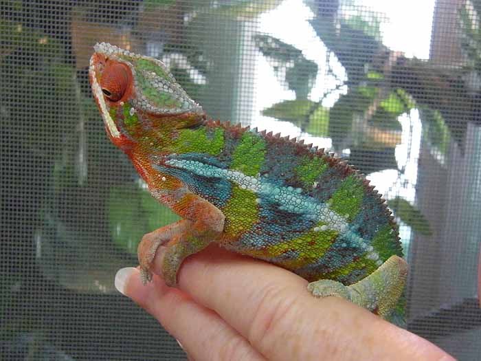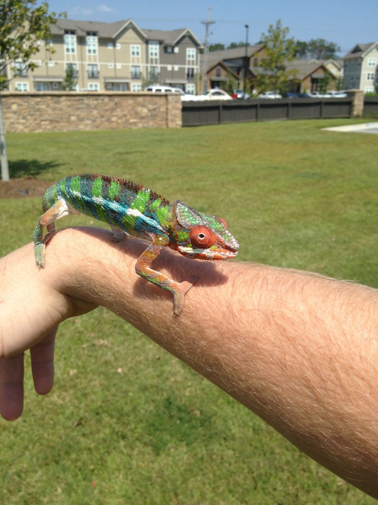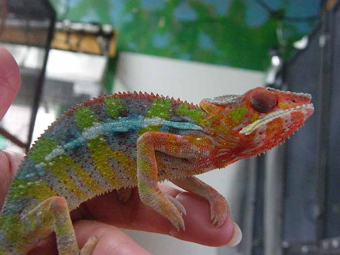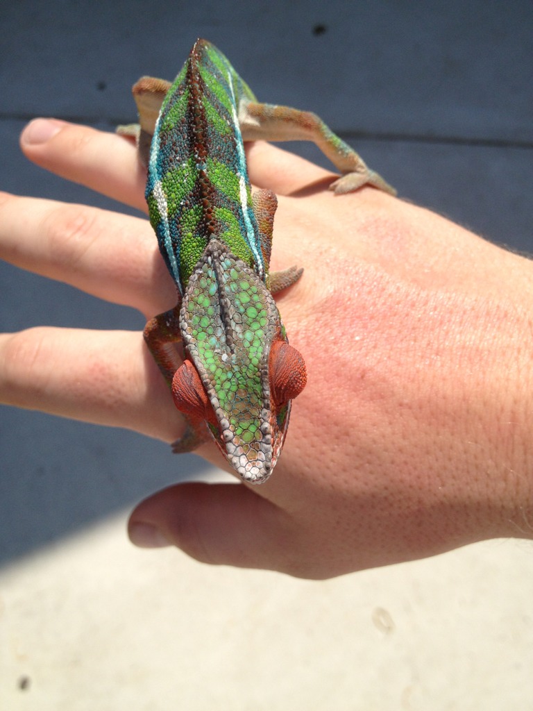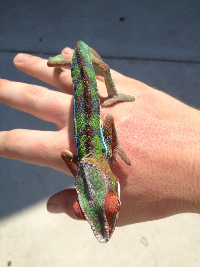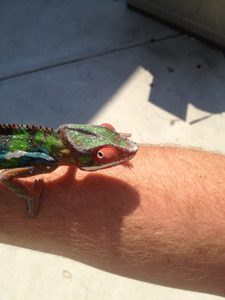For the longest time I've been wanting one of these beautiful "skittle" colored chameleons. Especially hearing how much better their temperament is compared to my previous Veiled. Well as luck would have it, Chameleons Northwest had a beautiful blue bar named Torpedo that they literally put up for sale minutes before I started looking. I swear it's as if it was mean't to be. Well we've changed his name to Zeus because he's defiantly king of the house, and the most magnificent reptile we've ever had. I think he may be a red body blue bar, as at 6 months he has a ton of red pigment coming through. Either way he's awesome and absolutely perfect. He's even helping me down all the butter worms I need to get rid of before they go bad. It's easier for me to add pics from tapatalk so I'll do that here in a second.